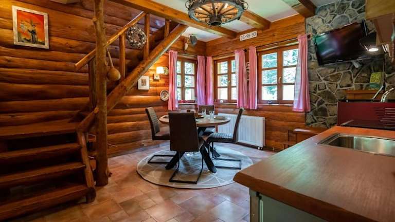 Die Unterkunft Forest Amerika - Ivcakova koliba bietet eine Bar und verschiedene Annehmlichkeiten, darunter kostenlosen Privatparkplatz und kostenfreies Wifi. Das Chalet verfügt über eine Veranda/Pati, einen Billardtisch und eine Terrasse mit Gartenblick.