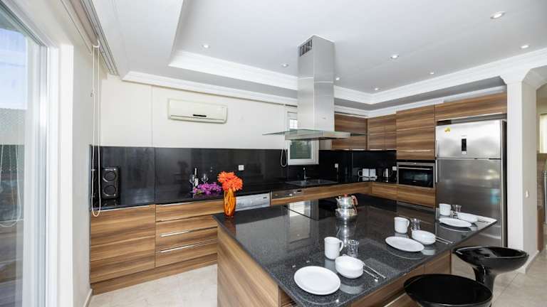 Die Villa verfügt über 4 Schlafzimmer sowie eine voll ausgestattete Küche, die mit einem Kühlschrank und einem Geschirrspüler ausgestattet ist. Sie bietet 5 Badezimmer mit Dusche, Haartrockner und Waschmaschine. Handtücher und Bettwäsche werden bereitgestellt. Ein Balkon ist ebenfalls Teil der Ausstattung.