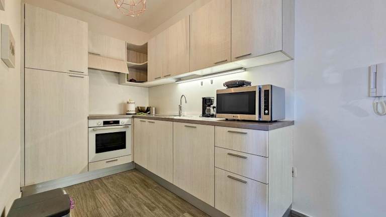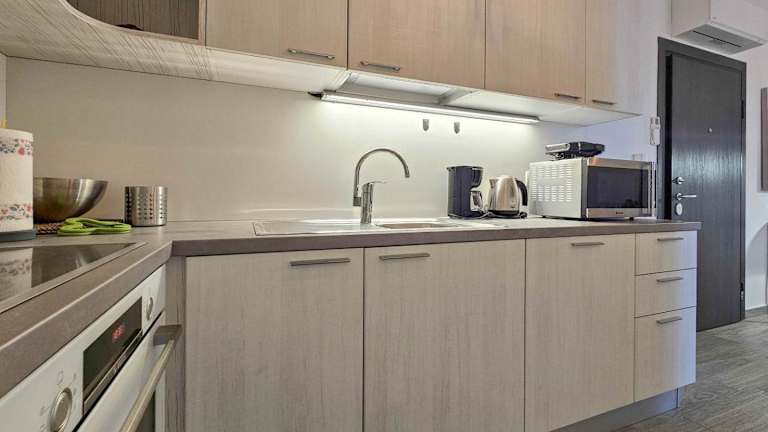 Die Ferienwohnung besteht aus einem Schlafzimmer und einem Wohnzimmer sowie einer voll ausgestatteten Küche, die mit einem Kühlschrank und einer Kaffeemaschine ausgestattet ist. Des Weiteren verfügt die Unterkunft über ein Badezimmer mit einem Bidet und einer Dusche. Handtücher und Bettwäsche werden ebenfalls zur Verfügung gestellt. Die Unterkunft ist klimatisiert und bietet Platz für eine angenehme Ferienzeit.