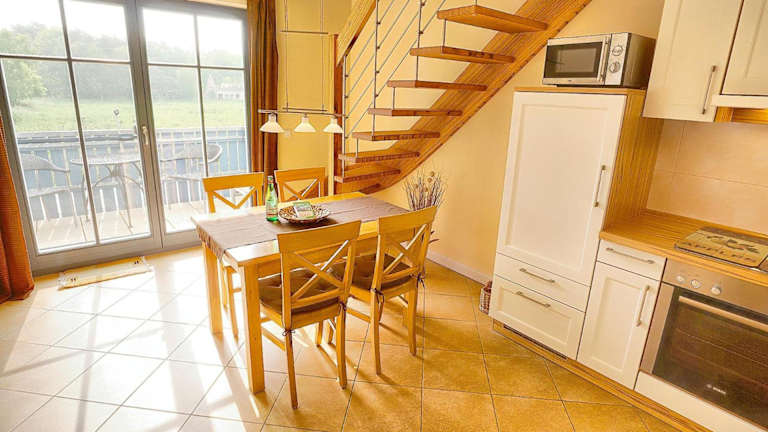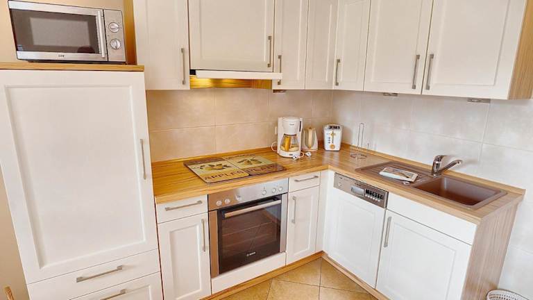 Die Küchenzeile der Ferienwohnung ist mit einem Kühlschrank, Geschirrspüler sowie einer Kaffeemaschine ausgestattet, was die Zubereitung eigener Mahlzeiten erleichtert. Keine Informationen zu weiteren Verpflegungsangeboten vorhanden.