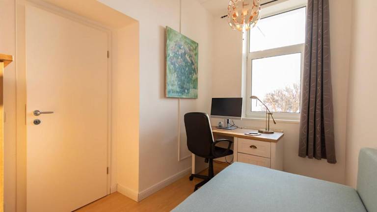 Die Ferienwohnung ist ausgestattet mit zwei Schlafzimmern, einem Wohnzimmer und einem Flachbild-TV. Eine gut ausgestattete Küchenzeile mit Kühlschrank und Geschirrspüler sowie einem Badezimmer mit Dusche steht zur Verfügung. Ein Balkon mit Meerblick ist ebenfalls vorhanden.