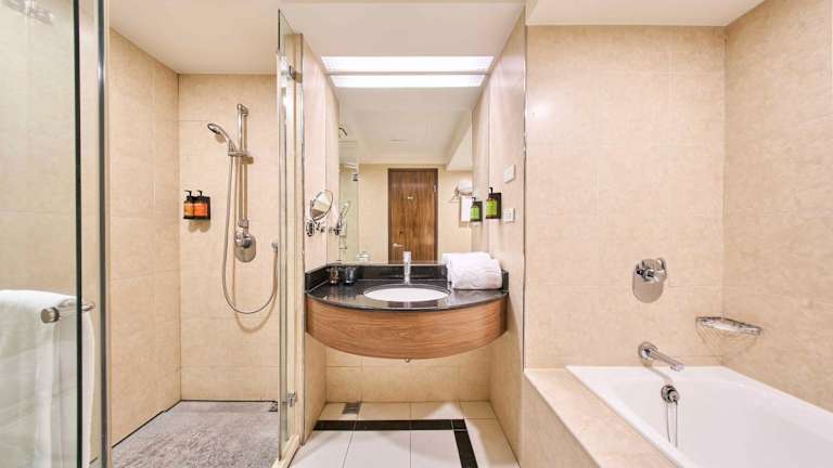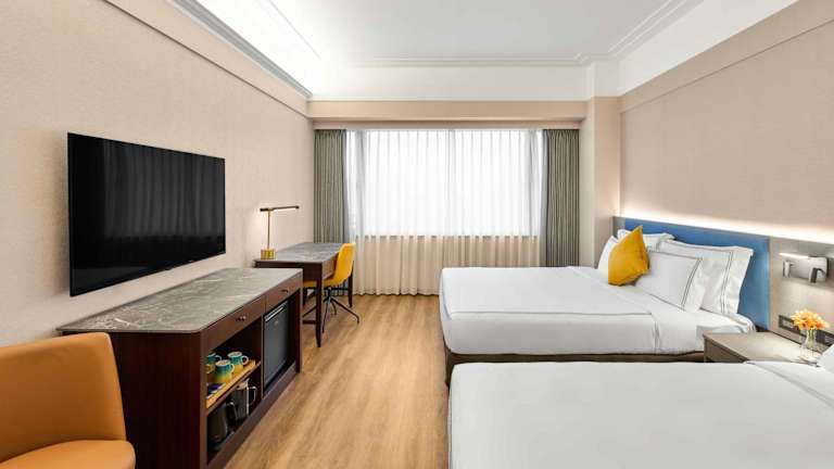 Die Zimmer sind klimatisiert und bieten ein behagliches Raumklima. Jedes Zimmer verfügt über ein Doppel- oder Queensize-Bett, eine Kochnische mit Kühlschrank und Tee-/Kaffeezubereiter, eine Minibar, einen Safe sowie einen Schreibtisch. Die Zimmer sind zudem mit einem TV mit Satelliten- oder Kabelempfang, einem Radio sowie kostenlosem Wifi ausgestattet. Das Badezimmer ist mit einer Dusche und Badewanne sowie einem Haartrockner und Kosmetikartikeln ausgestattet. Hausschuhe stehen den Gästen ebenfalls zur Verfügung. Für Familien und Nichtraucher gibt es spezielle Zimmer.