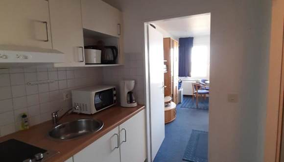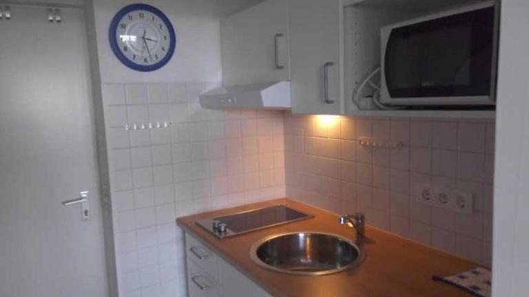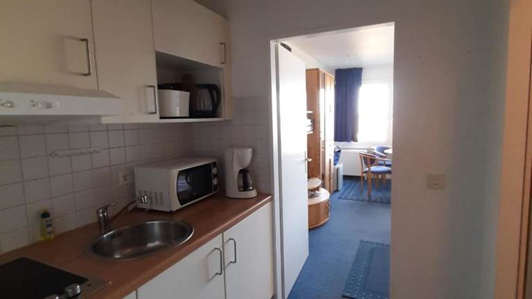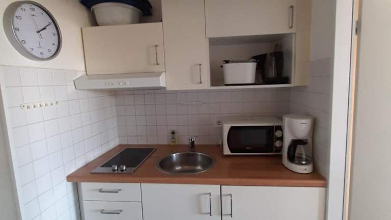 Die Küchenzeile in der Unterkunft ist ausgestattet mit einem Kühlschrank, einer Mikrowelle, einer Herdplatte sowie einer Kaffeemaschine und einem Wasserkocher. Verpflegungsmöglichkeiten im nahen Umfeld sind nicht näher beschrieben.