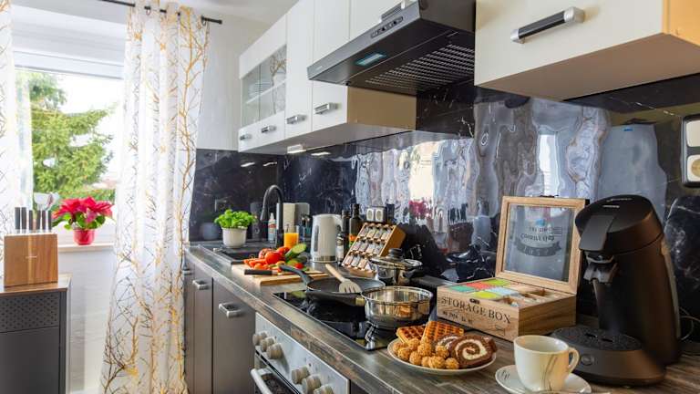 Essenslieferung in die Unterkunft ist möglich. Es stehen eine voll ausgestattete Küche mit Kühlschrank und Kaffeemaschine zur Verfügung.