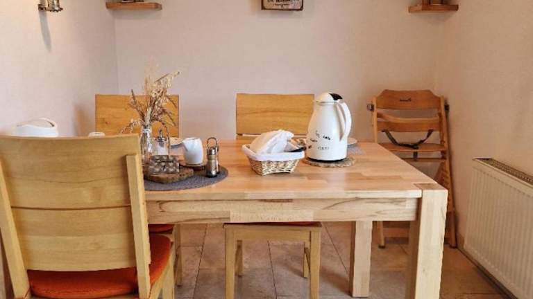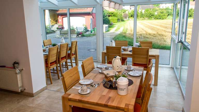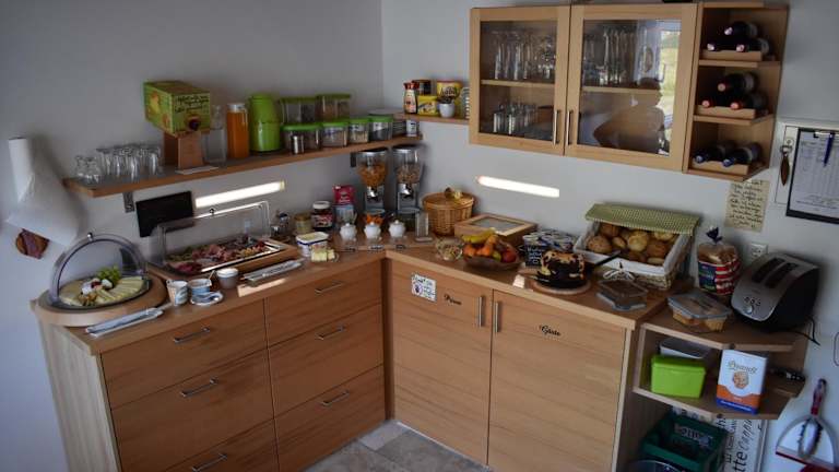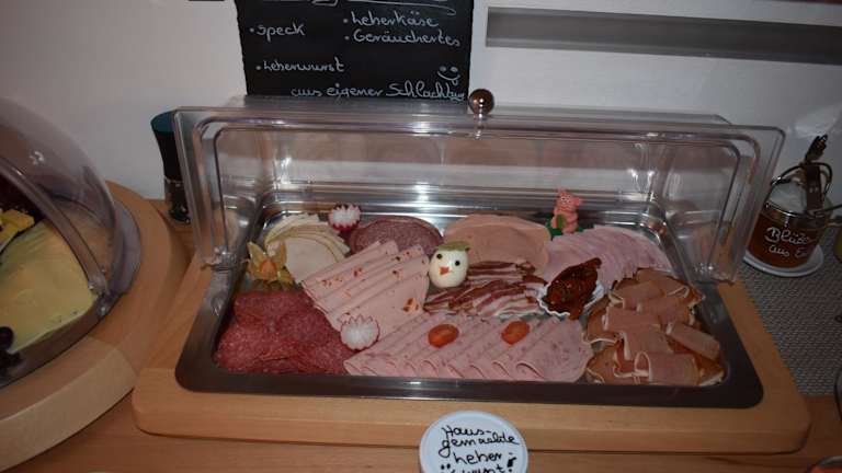 Morgens stärken sich die Gäste am reichhaltigen Frühstücksbuffet, welches im neu gebauten Frühstücksraum mit Panoramablick auf die Ruinen der mittelalterlichen Rumburg serviert wird. Ein Brötchenservice kann ebenfalls zusätzlich gebucht werden.