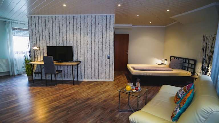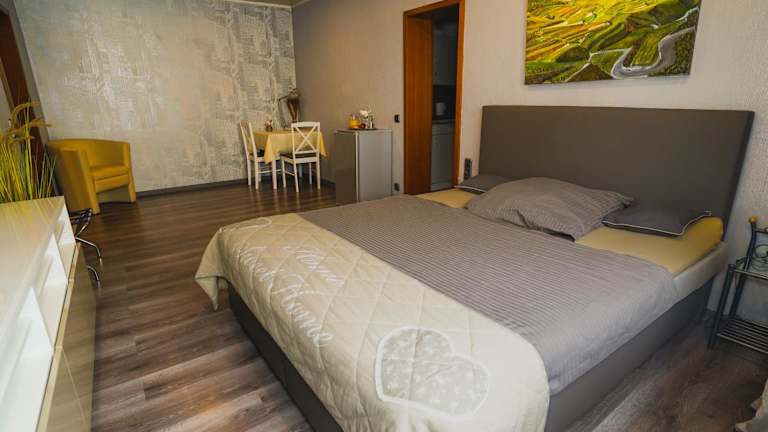 Alle Zimmer verfügen über Highspeed W Lan,TV,Du,WC und Safe Sie können wählen zwischen Doppelzimmer zur Einzelnutzung 68.-€ Doppelzimmer für 2 Personen: pro Person 42,50€ und Langzeitapartments : je nach Aufenthalt Preise ohne Frühstück. Frühstück + 7.-€