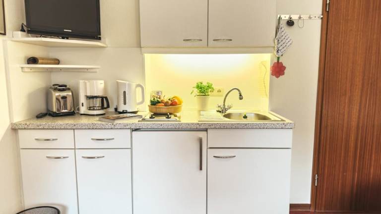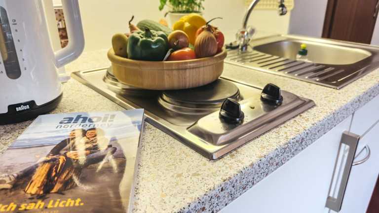 Die Ferienwohnung verfügt über eine Küche, die mit einem Kühlschrank, einer Herdplatte, einem Toaster sowie einer Kaffeemaschine und einem Wasserkocher ausgestattet ist. Details zur Verpflegung sind nicht angegeben.