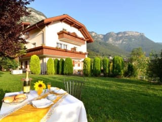 Familienfreundlicher Betrieb inmitten von Weinbergen und mit fantastischem Blick auf die umliegende Bergwelt mit mediterranem Garten und in den Ortskern von Kaltern.