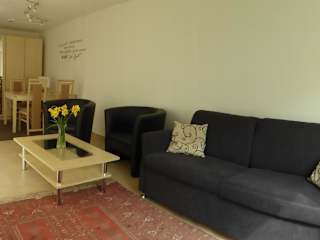 Die Ferienwohnung verfügt über ein Schlafzimmer, ein Wohnzimmer sowie eine gut ausgestattete Küche mit Kühlschrank und Ofen. Ein Flachbild-TV und ein Badezimmer mit Dusche sind ebenfalls vorhanden. Handtücher und Bettwäsche werden bereitgestellt, und die Terrasse bietet einen schönen Blick auf den Garten.