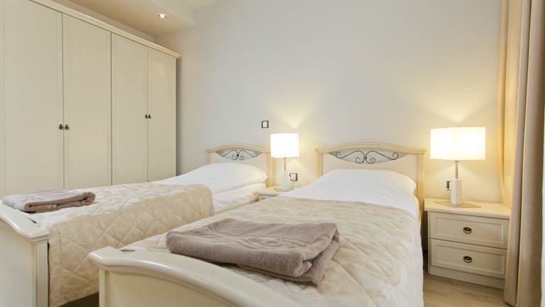Die klimatisierten Zimmer verfügen über einen Balkon oder eine Terrasse mit Meerblick. Alle Zimmer sind mit einem Queensizebett und einem Sofabett ausgestattet und bieten Platz für Zustellbetten. Zudem ist eine Kochnische mit Kühlschrank, Minikühlschrank und Tee-/Kaffeemaschine vorhanden. Ein TV-Gerät, ein Zimmer-Safe sowie gratis Wifi stehen zur Verfügung. Die Badezimmer sind mit Dusche und Badewanne sowie kostenfreien Pflegeprodukten ausgestattet. Es sind sowohl Familien- als auch Nichtraucherzimmer buchbar. Zusätzlich gibt es rollstuhlgerechte Zimmer.