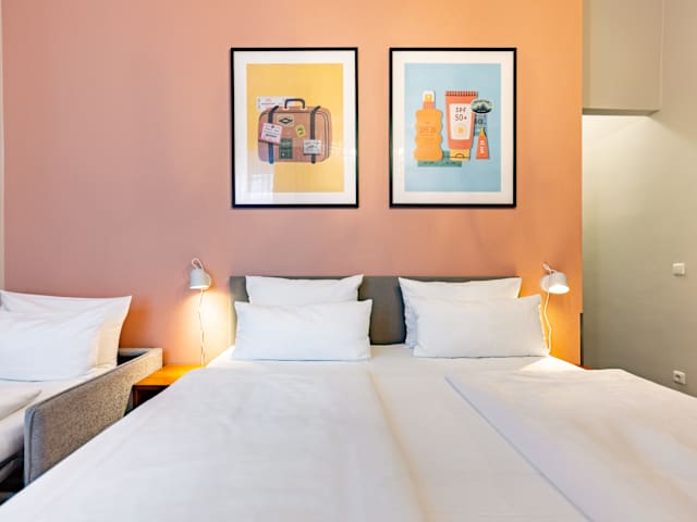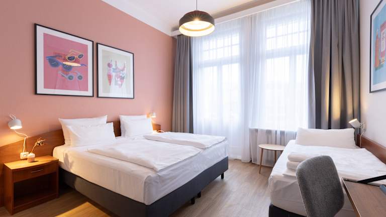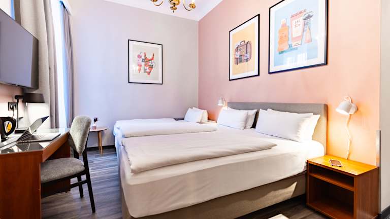 Unsere 65 Zimmer bieten ruhige Rückzugsorte mit gemütlichen Betten, Sitzecke, TV und eigenem Bad. Schallisolierte Fenster sorgen für erholsame Nächte. Freuen Sie sich auf kostenfreies WLAN, ein Frühstücksbuffet und unseren 24-Stunden-Service. Ob Stadtbesuch, Geschäftsreise oder Auszeit mit Familie, Freunden oder Hund – fühlen Sie sich wie zu Hause.