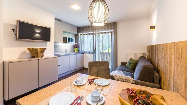 Das Apartment verfügt über einen Sitzbereich mit einem Sofa und einem LCD-Sat-TV. Die gut ausgestattete Küchenzeile bietet eine Kaffeemaschine, wodurch eine selbständige Verpflegung ermöglicht wird.