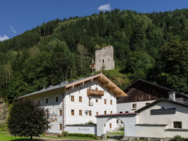 Der Weyerhof - Gasthof mit Gourmet Restaurant und 4-Sterne Boutique Hotel - liegt im Süden des Kitzbüheler Skigebietes, nicht weit von Zell am See entfernt. Wer hier im Winter zu Besuch kommt, hat gleich zwei Skigebiete direkt vor der Haustüre: Erstens die fünf Autominuten entfernte Wildkogel Arena, und zweitens das gesamte Areal des Kitzbüheler Skigebietes mit 57 Seilbahnen und 185 Pistenkilometern. Der Sommer ist ein Paradies für alle Bergsport-Fans - vom Wandern bis zum Downhill-Biken - von den Grasbergen der Kitzbüheler Alpen bis zum Nationalpark Hohe Tauern - hier findet jeder seinen Lieblingsbeschäftigung. Lohnenswerte Ausflüge unternehmen Sie in nur kurzer Fahrzeit zu den Krimmler Wasserfällen, nach Kitzbühel oder nach Zell am See. Der Historische Weyerhof wird von Familie Meilinger seit 7 Generationen geführt und ist weithin bekannt für sein Gourmet Restaurant, welches Juniorchef Franz Meilinger und sein Team betreibt. Es gibt feinste Spezialitäten mit Focus auf Regionalität. Die 15 liebevoll renovierten Zimmer bieten neben hochwertiger Ausstattung mit naturbelassenen Materialien auch voll ausgestattete Bäder mit Dusche/WC.