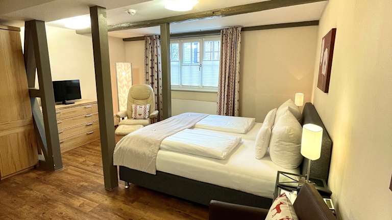 Alle Doppelzimmer, Appartements und Suiten sind mit kleiner Küchenzeile, Minibar, einem Föhn, Flat-TV und Telefon ausgestattet. Die Appartements und Suiten verfügen teilweise über einen getrennten Wohn- und Schlafbereich. Die Einzelzimmer sind individuell eingerichtet.