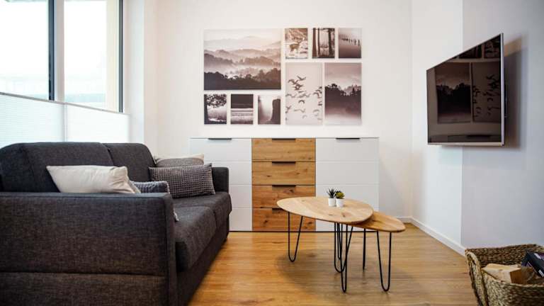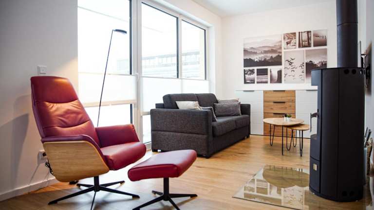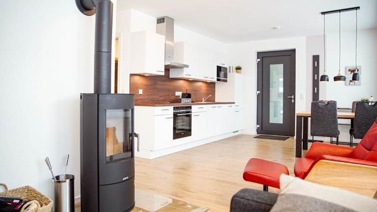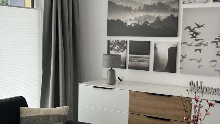 Die Ferienwohnung verfügt über ein Schlafzimmer, ein Wohnzimmer sowie eine gut ausgestattete Küche mit Kühlschrank und Geschirrspüler. Handtücher und Bettwäsche werden bereitgestellt.