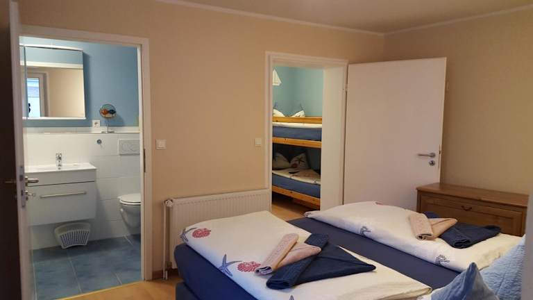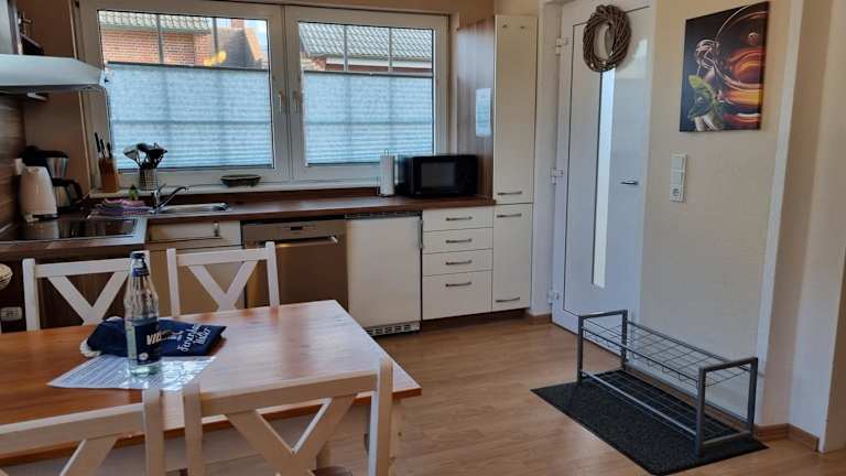 Die Ferienwohnung im Erdgeschoss verfügt über 2 Schlafzimmer, eine voll ausgestattete Küche mit Kühlschrank, Geschirrspüler, Waschmaschine, Ofen und Mikrowelle sowie einen TV mit Satellitenkanälen. Handtücher und Bettwäsche werden bereitgestellt.