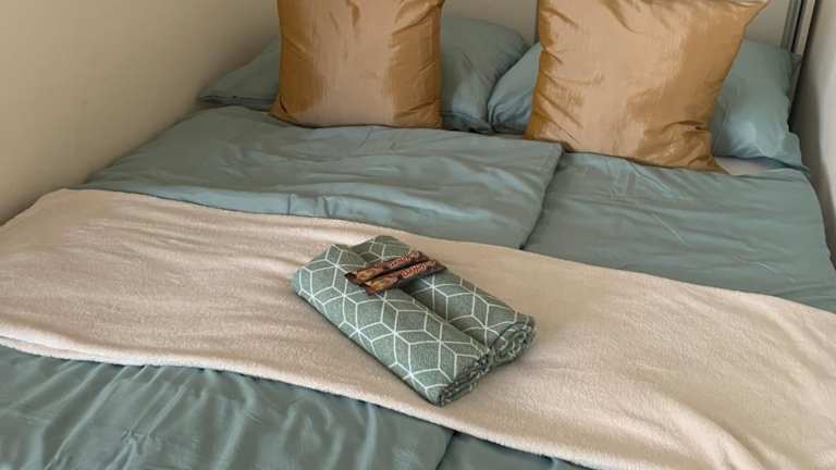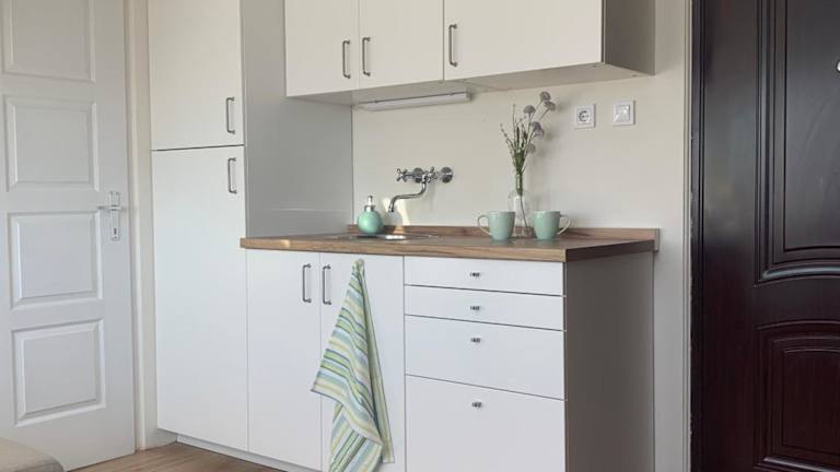 Die Ferienwohnung besteht aus einem Schlafzimmer, einem Wohnzimmer sowie einer voll ausgestatteten Küche mit Kühlschrank und Wasserkocher. Ein Badezimmer mit Dusche sowie kostenlosen Pflegeprodukten ist ebenfalls vorhanden. Handtücher und Bettwäsche werden bereitgestellt. Die Unterkunft ist auf der 5. Etage gelegen und hat keinen Lift.