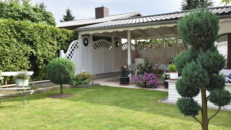 Der Bungalow verfügt über ein Schlafzimmer und ein Wohnzimmer, das mit einem TV ausgestattet ist. Eine gut eingerichtete Küche mit Kühlschrank und Ofen sowie ein Badezimmer mit Dusche sind vorhanden. Die Terrasse bietet Gartenblick und schafft eine angenehme Atmosphäre für entspannte Stunden im Freien.
