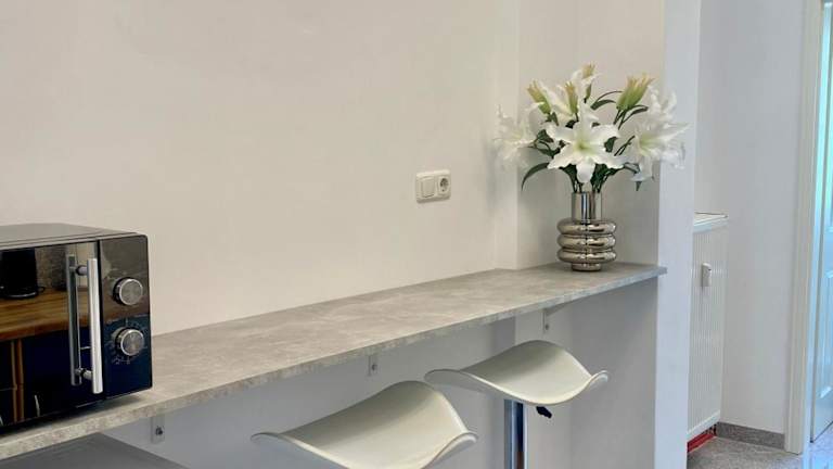In der Ferienwohnung steht eine Küche zur Verfügung, ausgestattet mit einem Kühlschrank, einer Mikrowelle und einem Wasserkocher. Handtücher und Bettwäsche werden bereitgestellt, jedoch sind keine spezifischen Verpflegungsmöglichkeiten angegeben.