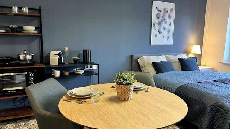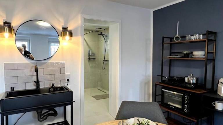Die Unterkunft verfügt über eine voll ausgestattete Küchenzeile mit Kühlschrank und Mikrowelle. Es stehen keine speziellen Verpflegungsmöglichkeiten zur Verfügung, jedoch haben Gäste die Möglichkeit, Selbstverpflegung zu organisieren.