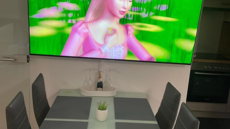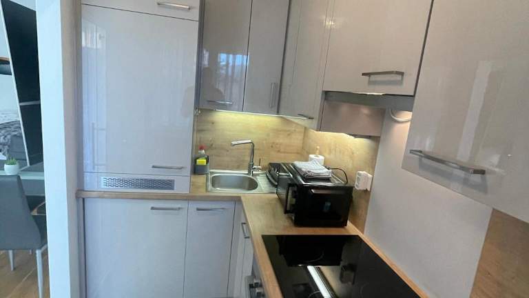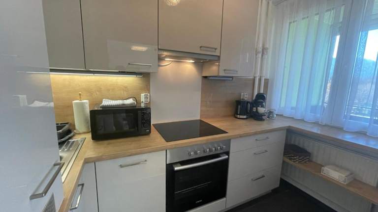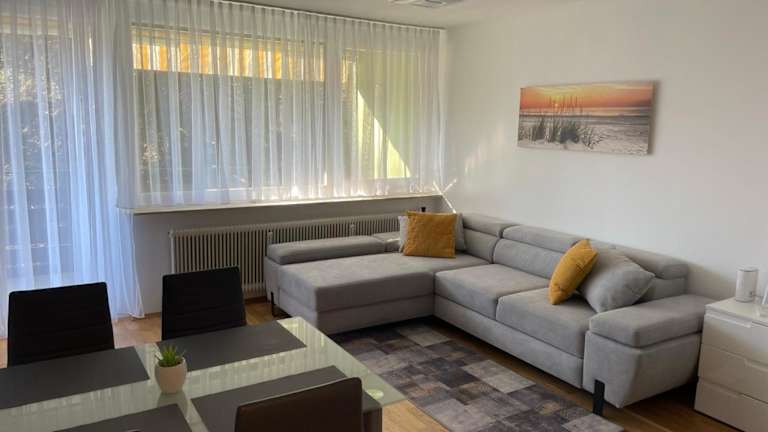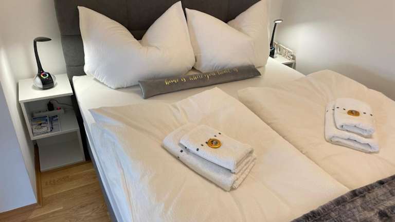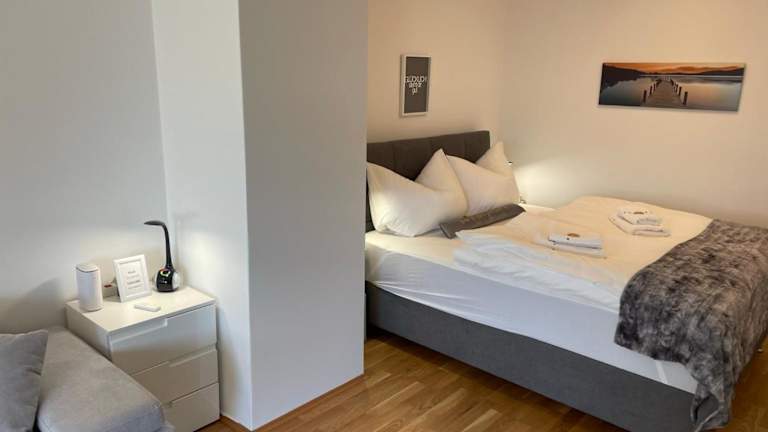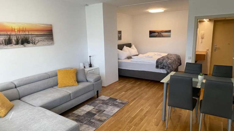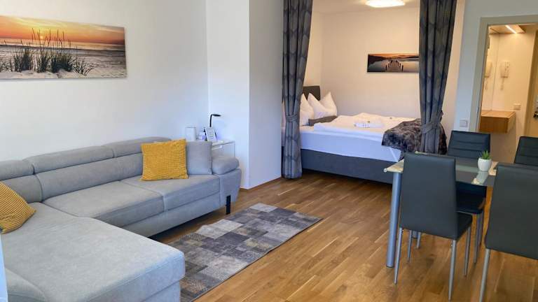Die Ferienwohnung umfasst ein Schlafzimmer, ein Wohnzimmer sowie eine gut ausgestattete Küche mit Kühlschrank und Geschirrspüler. Handtücher und Bettwäsche werden bereitgestellt.