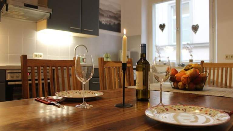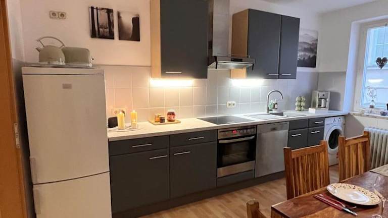 Eine gut ausgestattete Küche mit Kühlschrank und Geschirrspüler ermöglicht es Gästen, ihre Mahlzeiten selbst zuzubereiten, sodass die Ganztägige Verpflegung flexibel gestaltet werden kann.