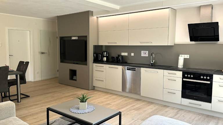 In jeder Wohneinheit gibt es ein Schlafsofa, einen Sitzbereich sowie einen Flachbild-TV mit Satellitenkanälen. Die gut ausgestattete Küche umfasst einen Kühlschrank, einen Geschirrspüler, einen Ofen, eine Kaffeemaschine und einen Wasserkocher. Das eigene Badezimmer ist mit einer Dusche und einer Badewanne ausgestattet.
