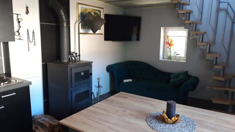 Das Ferienhaus verfügt über ein Schlafzimmer sowie eine Küchenzeile mit einem Kühlschrank und einer Mikrowelle. Für eine angenehme Atmosphäre sorgen der Satelliten Flachbild-TV und die bereitgestellten Handtücher und Bettwäsche.