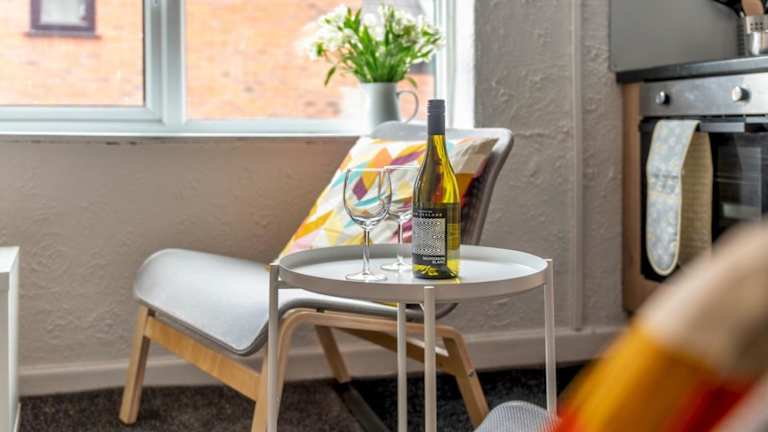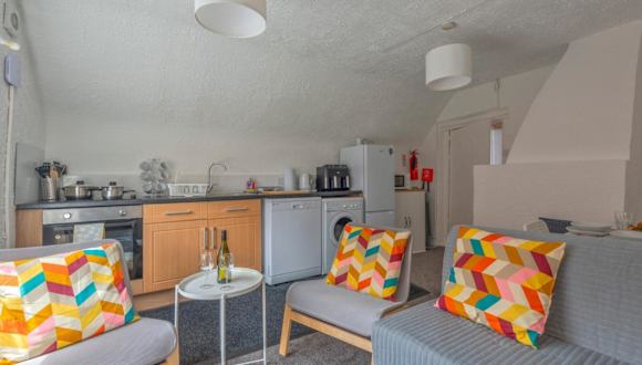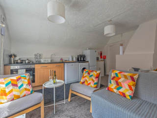 Die Ferienwohnung bietet ein Wohnzimmer mit TV, eine voll ausgestattete Küche mit Kühlschrank und Geschirrspüler sowie ein Badezimmer mit Dusche.