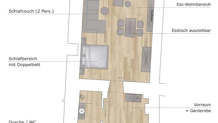 Die Ferienwohnung verfügt über ein Schlafzimmer und ist mit einem TV mit Satellitenkanälen ausgestattet. Die gut eingerichtete Küche beinhaltet einen Kühlschrank und eine Herdplatte. Ein Badezimmer mit einer Dusche ist ebenfalls vorhanden. Handtücher und Bettwäsche werden bereitgestellt.