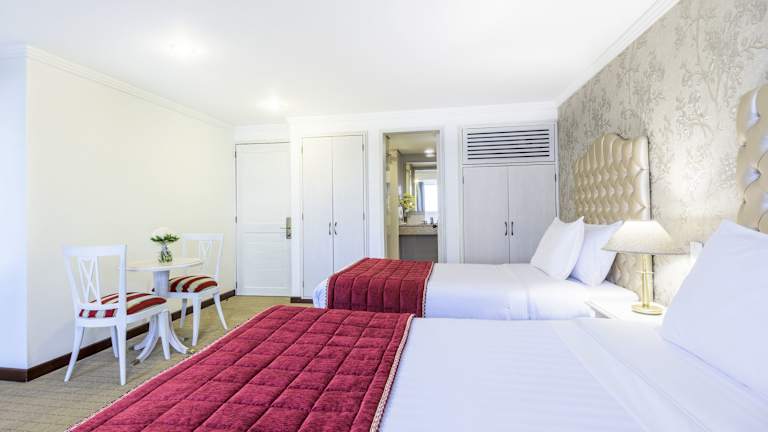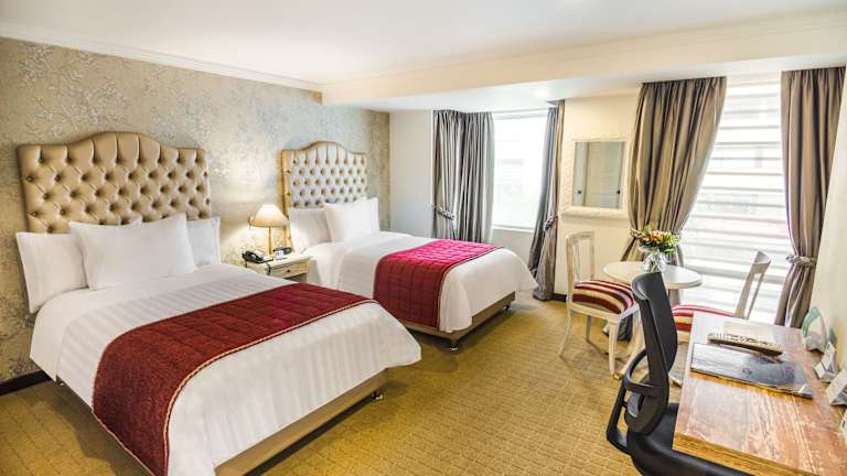 Die Zimmer verfügen über eine Klimaanlage sowie individuell regulierbare Heizung. Jedes Zimmer ist ausgestattet mit einem Doppelbett oder Queensize-Bett, einem Safe, einer Minibar sowie einem Kühlschrank. Des Weiteren stehen ein Telefon mit Direktwahl, ein Fernseher mit Kabelempfang, ein Radio und kostenfreies Wifi zur Verfügung. Die Badezimmer sind mit einer Dusche und Badewanne ausgestattet und bieten einen Haartrockner. Es stehen auch rollstuhlgerechte Zimmer zur Verfügung.