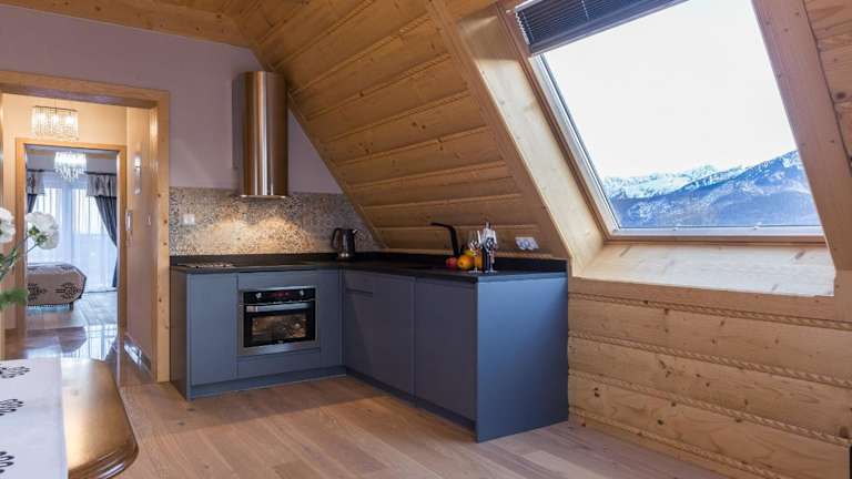 Die Zimmer in der Giewont Residence sind mit einem Balkon und Bergblick ausgestattet. Jedes Zimmer verfügt über einen Sitzbereich, einen Kabel-Flachbild-TV sowie eine voll ausgestattete Küche mit Kühlschrank und Herdplatte. Ein eigenes Badezimmer mit Dusche und kostenloser Pflegeprodukten ist ebenfalls vorhanden.