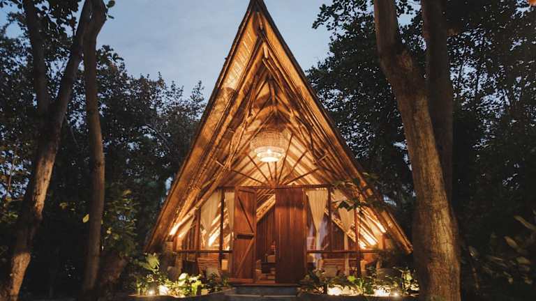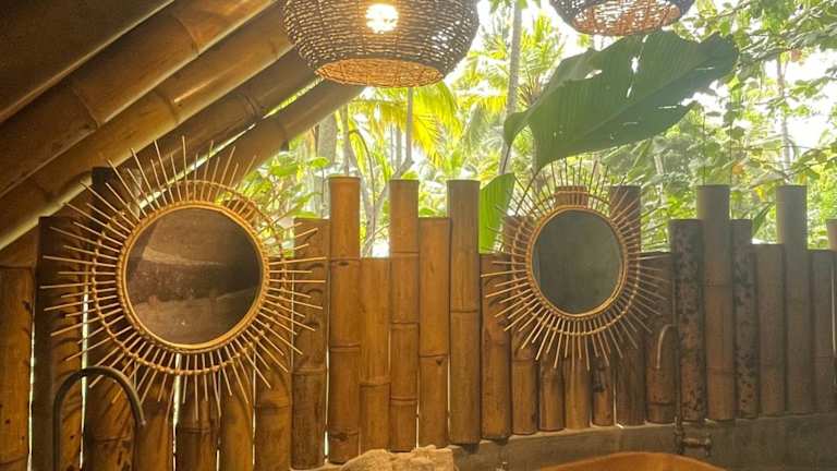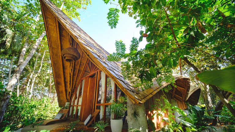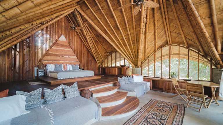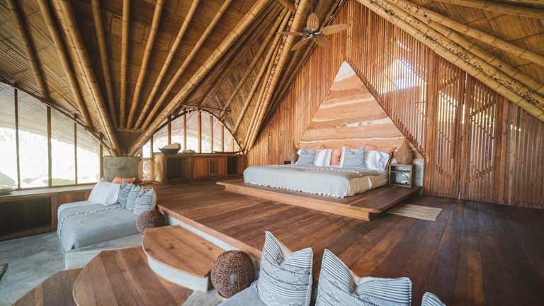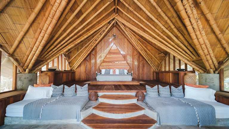 Die Zimmer und Suiten verfügen über rustikale Strohdächer, einen Kleiderschrank sowie ein grosses Bad mit Dusche und WC. Die Gäste geniessen einen Gartenblick.