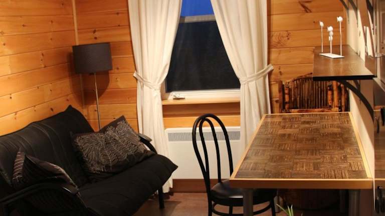 Das Gîte chez Majo ist ein einladendes Cottage, das durch Holzakzente und Pflanzen liebevoll dekoriert ist. Die Unterkunft bietet eine heimelige Atmosphäre und eine entspannte Umgebung.
