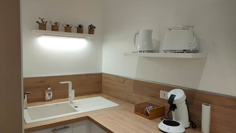 Die Ferienwohnung besteht aus 2 Schlafzimmern, einem Wohnzimmer und einer voll ausgestatteten Küche, die einen Kühlschrank und eine Kaffeemaschine umfasst. Ein Badezimmer mit Dusche und Haartrockner ist ebenfalls vorhanden. Handtücher und Bettwäsche werden bereitgestellt.