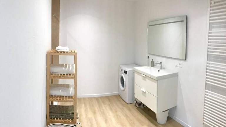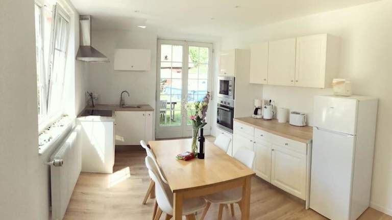 Die Ferienwohnung umfasst ein Schlafzimmer, eine hochwertige Küche mit Kühlschrank und Geschirrspüler, einen Flachbild-TV, einen gemütlichen Sitzbereich sowie ein Badezimmer mit Dusche. Handtücher und Bettwäsche werden bereitgestellt.