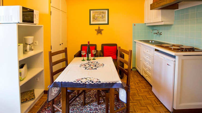 In der voll ausgestatteten Küche stehen verschiedene Annehmlichkeiten zur Verfügung, darunter ein Kühlschrank, ein Ofen, eine Mikrowelle, eine Herdplatte und eine Kaffeemaschine. Für die Selbstverpflegung ist somit bestens gesorgt.