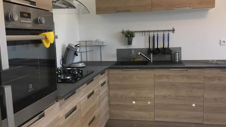 Es ist eine voll ausgestattete Küche vorhanden, die mit einem Kühlschrank, Geschirrspüler, Ofen, Mikrowelle, Herdplatte und Kaffeemaschine ausgestattet ist. Für die Verpflegung gibt es keine Informationen über weitere Essensmöglichkeiten in der Unterkunft.