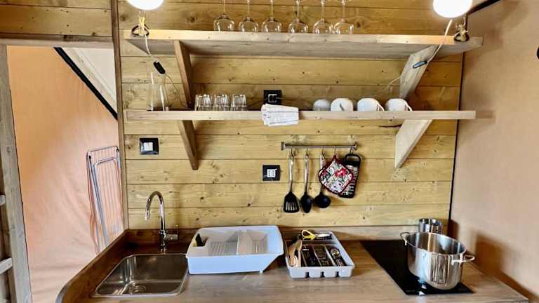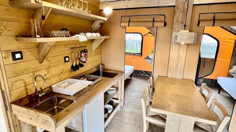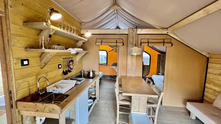Glamping Camping Rivabella bietet Übernachtungsmöglichkeiten in einem heimeligen Ambiente mit Garten und eigenem Strandbereich. Zusätzlich stehen eine Terrasse, ein Restaurant sowie eine Bar zur Verfügung. Die Unterkunft ermöglicht einen direkten Zugang zur Natur und zu verschiedenen Freizeitmöglichkeiten.