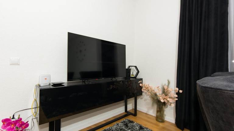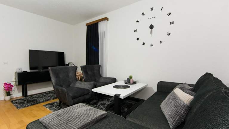 Die Ferienwohnung im Erdgeschoss besitzt zwei Schlafzimmer und ist ausgestattet mit einem Flachbild-TV mit Kabelkanälen. Zudem steht den Gästen eine voll ausgestattete Küche zur Verfügung, die einen Kühlschrank, einen Geschirrspüler, eine Waschmaschine, einen Ofen sowie eine Mikrowelle umfasst.