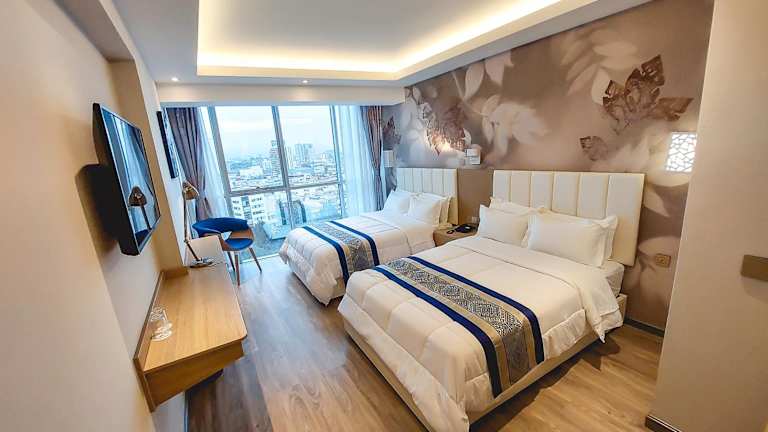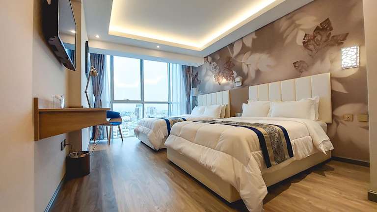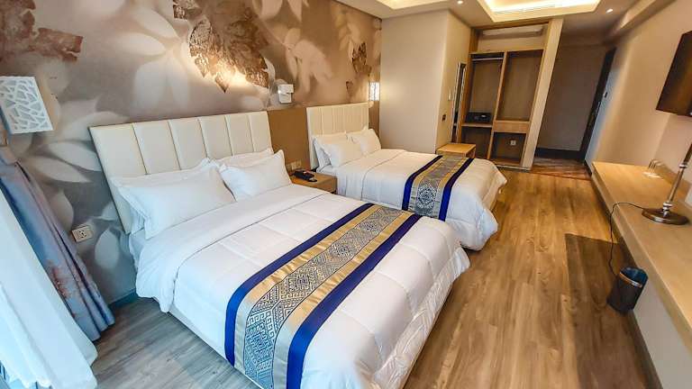 Die klimatisierten Zimmer des Gold Source Hotel verfügen über einen Schreibtisch, einen Safe, einen Flachbild-TV und ein eigenes Badezimmer mit Dusche. Alle Wohneinheiten sind mit einem Kleiderschrank ausgestattet.