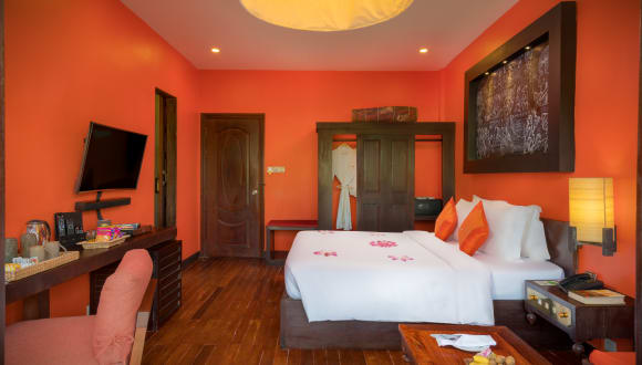 At only eight kilometres from Angkor Wat, 10 from the airport, and just one kilometre from downtown Siem Reap, the Golden Temple Hotel is conveniently located on busy 7 Makara Street. The Hotel with it's colourful décor blended with high quality furnishings and cultural artwork and design are a firm favourite of couples and young families alike. Like the other Golden Temple properties, the Hotel provides relaxing spa, pool, bar and good quality restaurant. The restaurant serves both Western and local gastronomic delights. All rooms are air-conditioned and offer flat-screen TVs with satellite channels and many modern comforts. Each room has en-suite shower room with quality fittings. Recognising the importance of guest service, the team constantly work to improve language skills, proactivity, cultural awareness and interpersonal skills.