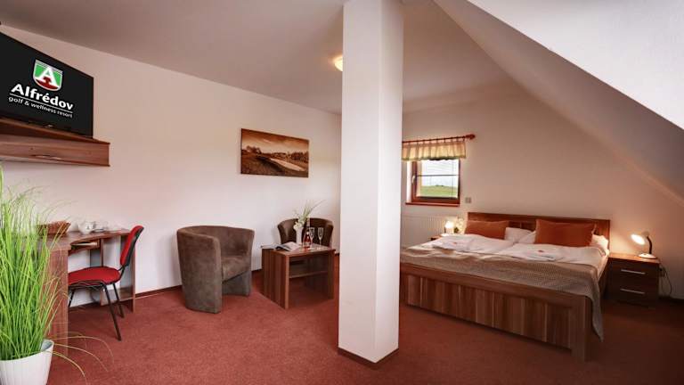 Das Golf&Wellness Resort Alfrédov bietet Übernachtungsmöglichkeiten mit einem Fitnesscenter sowie einem Garten und einer Gemeinschaftslounge. Die Unterkunft überzeugt durch einen Zimmerservice und ein Restaurant mit Terrasse. Es stehen kostenfreies Wifi und kostenpflichtige Flughafentransferdienste zur Verfügung.