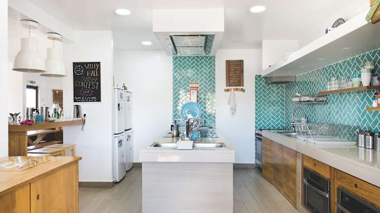 Die Gemeinschaftsküche ermöglicht es den Gästen, eigene Mahlzeiten zuzubereiten. Im grossen Speisesaal können die Gäste ihre Mahlzeiten einnehmen und Kontakte zu anderen Gästen knüpfen.