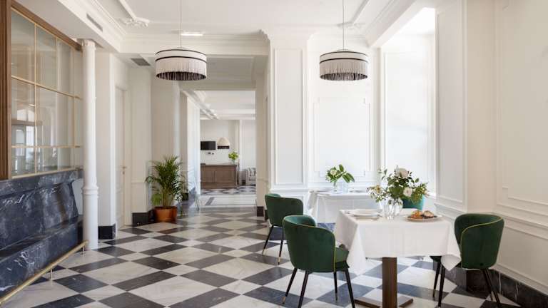 Beim Frühstück werden reichhaltige, vegetarische oder vegane Optionen in Buffetform angeboten. Das hoteleigene Restaurant bietet mediterrane Küche mit Möglichkeiten für spezielle Ernährungsbedürfnisse, welche auf Anfrage bereitgestellt werden. Für kleine Snacks wird ein Café im Hotel angeboten.