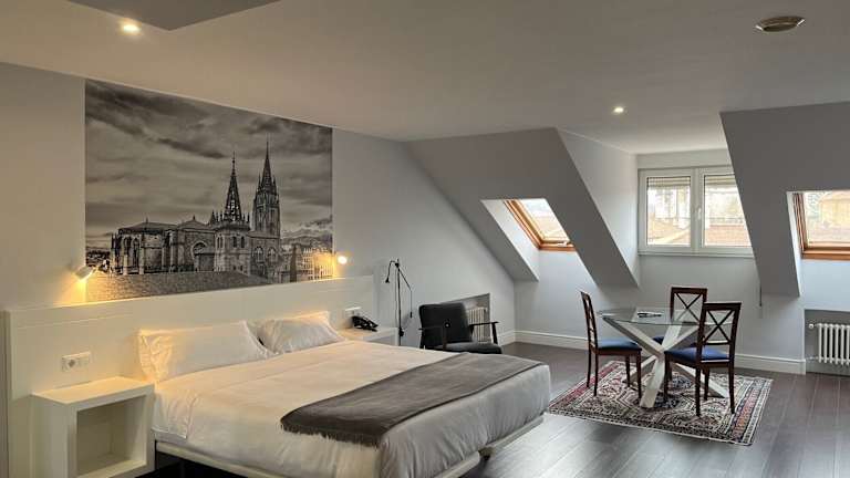 Das Hotel befindet sich im Herzen von Oviedo, direkt gegenüber der Kathedrale und in der Nähe bedeutender Sehenswürdigkeiten der Stadt. Einkaufsmöglichkeiten und öffentliche Verkehrsanbindungen sind ebenfalls in der Nähe. Die Entfernungen betragen ca. 30 km zum Strand, 1 m zum Stadtzentrum, 10,5 km zum Golfplatz und 1,5 km zum Bahnhof.