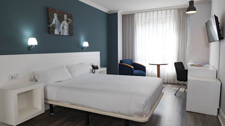 Die Zimmer sind modern und geräumig, ausgestattet mit Heizung, Teppichböden und bieten Balkon oder Terrasse mit Blick auf die Stadt oder den Monte Naranco. Jedes Zimmer verfügt über ein Queensizebett, ein Sofabett, einen Safe, eine Minibar, einen Schreibtisch sowie eine Telefonanlage mit Direktwahl. Zur Unterhaltung stehen ein TV-Gerät mit Satelliten-/Kabelempfang, ein Radio und WLAN zur Verfügung. Die Badezimmer sind mit Dusche und Badewanne, Haartrockner sowie Kosmetikartikeln ausgestattet. Es stehen rollstuhlgerechte Zimmer zur Buchung bereit. Die gesamte Unterkunft besteht aus Nichtraucherzimmern.