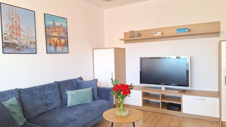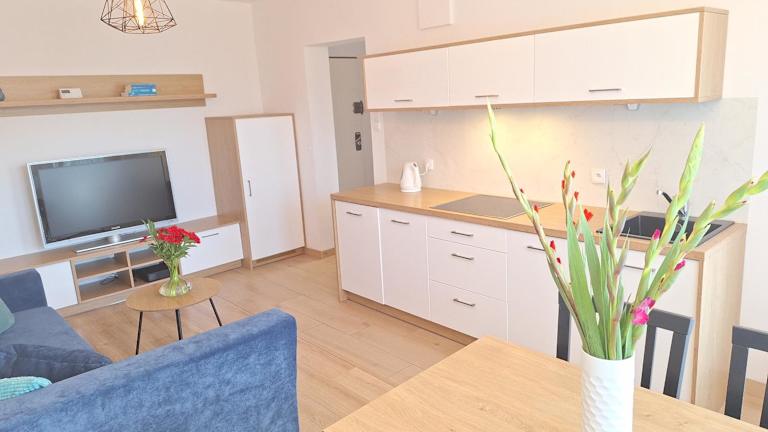 Das Apartment mit 1 Schlafzimmer umfasst ein Wohnzimmer mit einem Flachbild-TV, eine voll ausgestattete Küchenzeile mit Kühlschrank und Geschirrspüler sowie ein Badezimmer mit Dusche. Handtücher und Bettwäsche sind verfügbar. Ein Balkon lädt zum Entspannen ein.