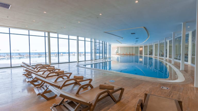 Das Hotel bietet sowohl Innen- als auch Aussenpools, die ideal für Aquatraining und aktive Erholung sind. Auf der Sonnenterrasse stehen Liegen und Schirme zur Verfügung. Es gibt zahlreiche Möglichkeiten zur Freizeitgestaltung, darunter Golf, ein Fitnessstudio, ein Spa, eine Sauna, ein Dampfbad und ein Hammam.