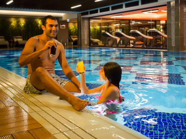 Das Hotel bietet ein umfangreiches Sport- und Freizeitangebot. Es gibt mehrere Pools, darunter ein beheizter Aussenpool, ein Innenpool sowie ein Kinderbecken. Der Fitnessraum lädt zu einem abwechslungsreichen Workout ein. Zur Entspannung stehen verschiedene Wellnessangebote wie Spa, Sauna, Dampfbad und Massagen zur Verfügung. Eine Sonnenterrasse lädt ebenfalls zum Verweilen ein.
